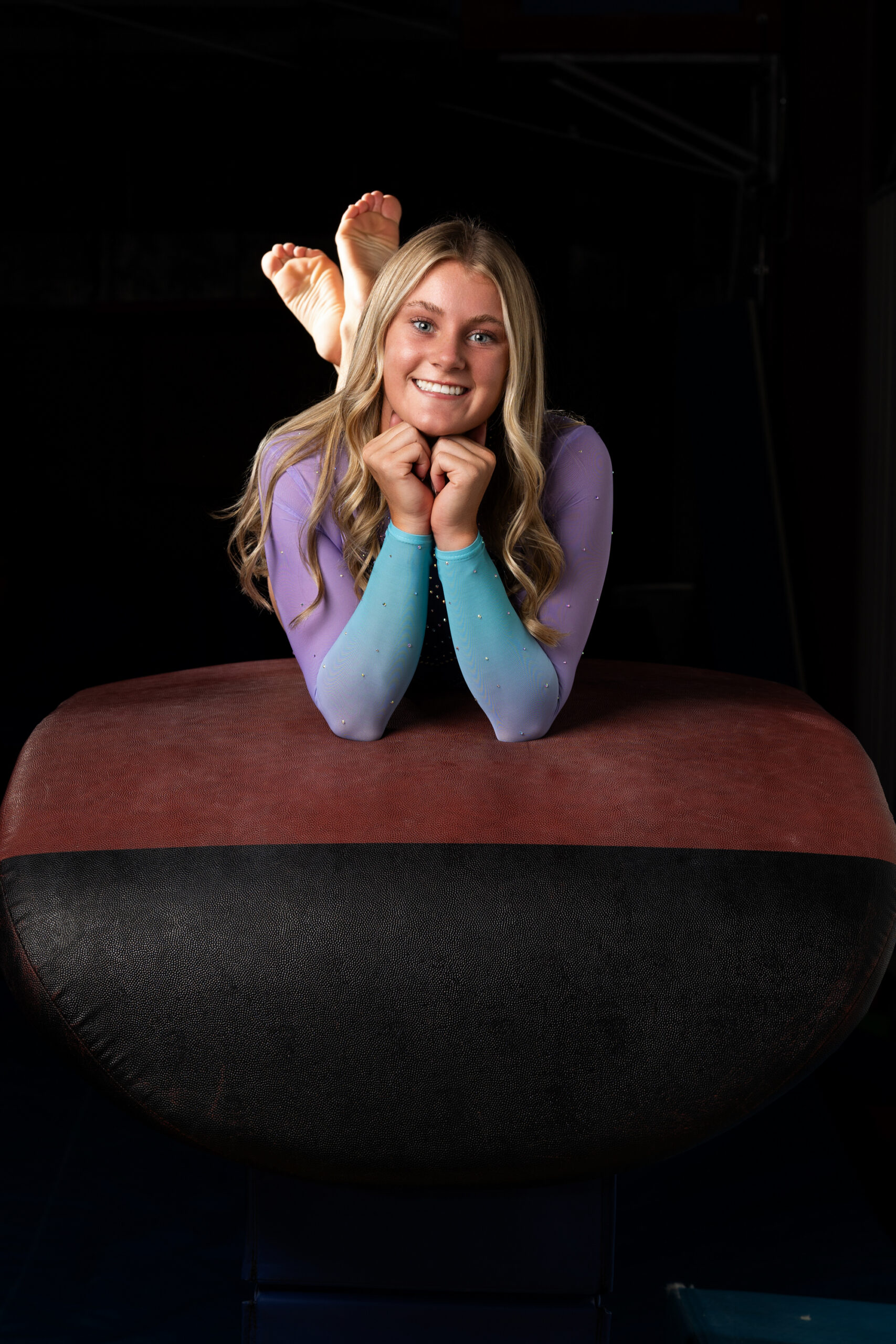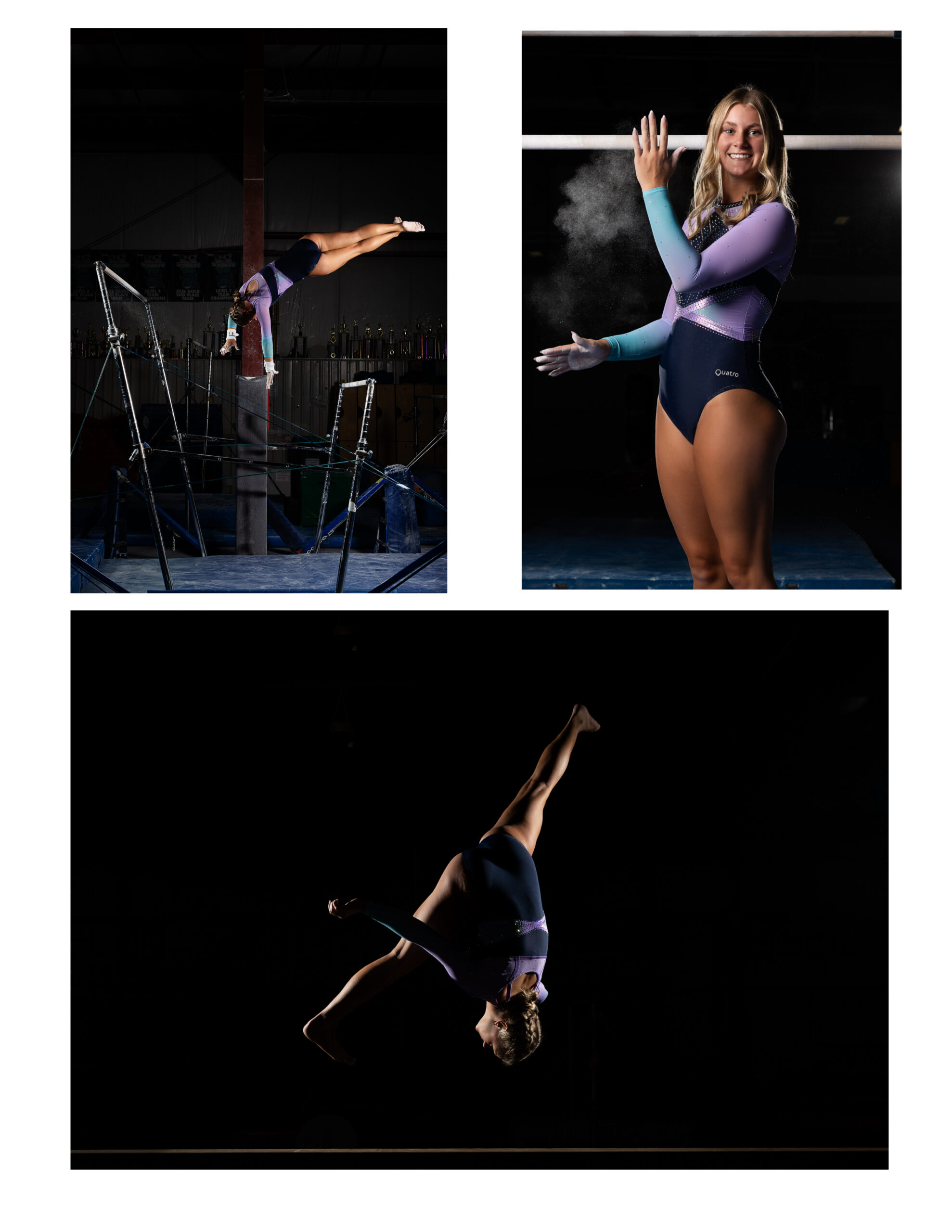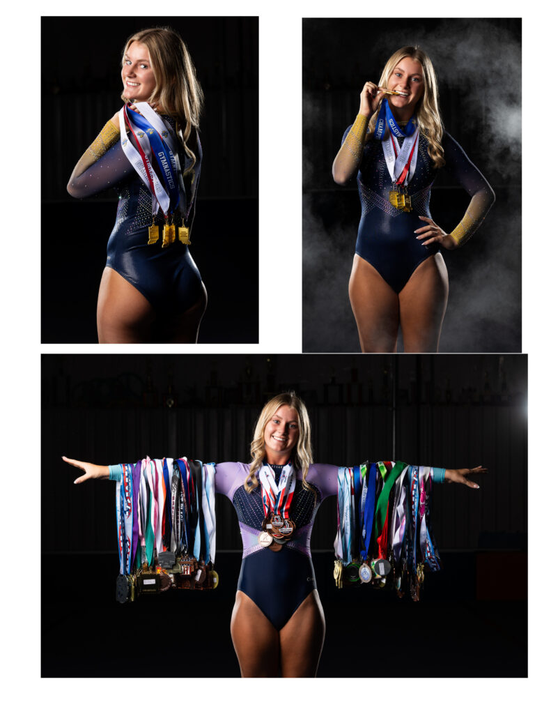 She wanted something dramatic, so we set up lighting with a dark background to really highlight her strength and movement. We started with posed portraits in her Bishop Dwenger leotard before switching into her competition leo. She also brought along her medals, which added a really special storytelling element to the portraits.