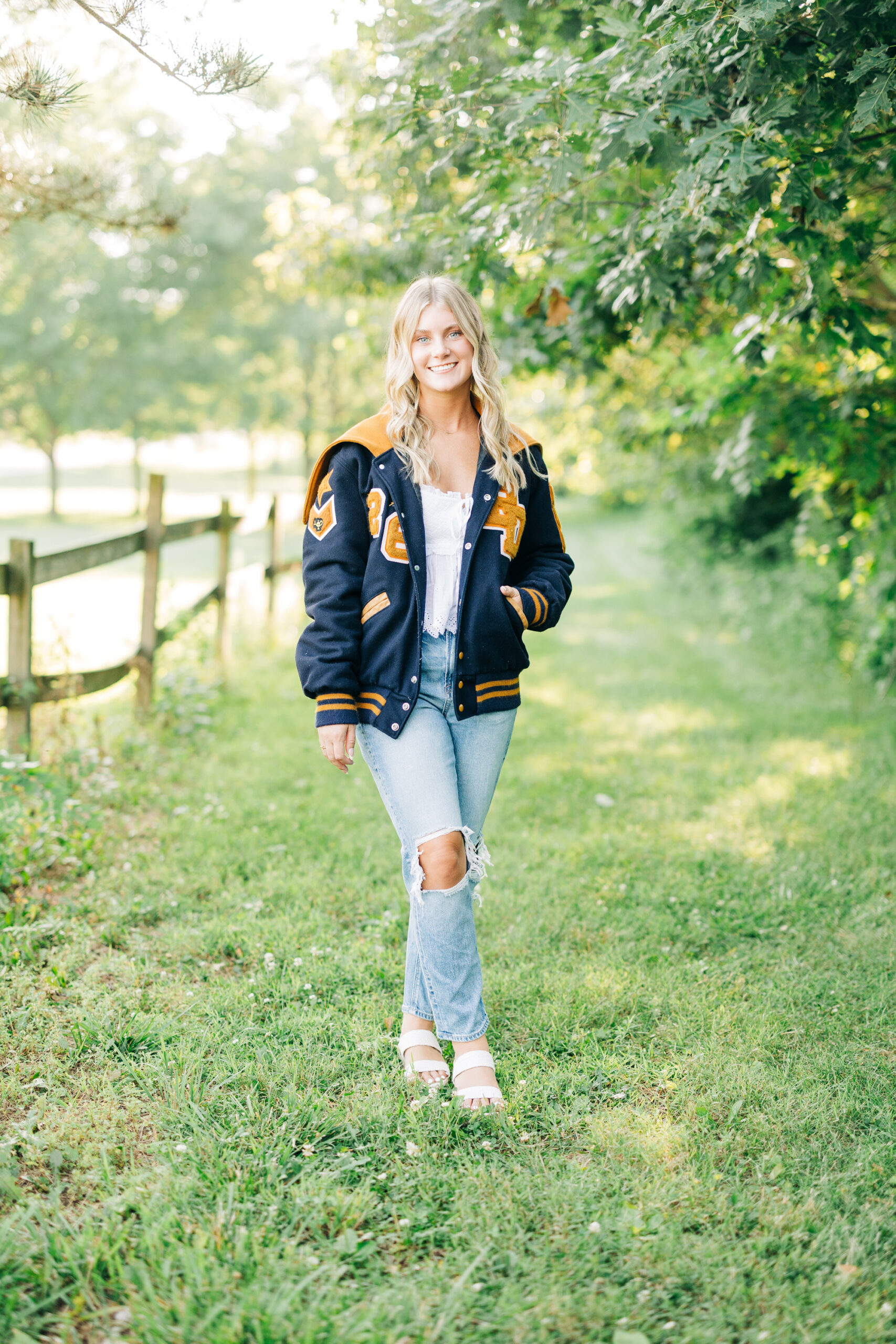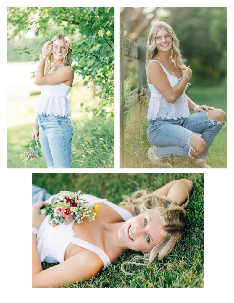 We began Avery’s session at Metea Park with a casual summer look. She wore jeans and a cute top, and I brought along a bouquet of wildflowers to add a little Midwest summer charm to the photos. The soft light and open fields were the perfect setting to ease into the session and capture some natural, relaxed portraits.
